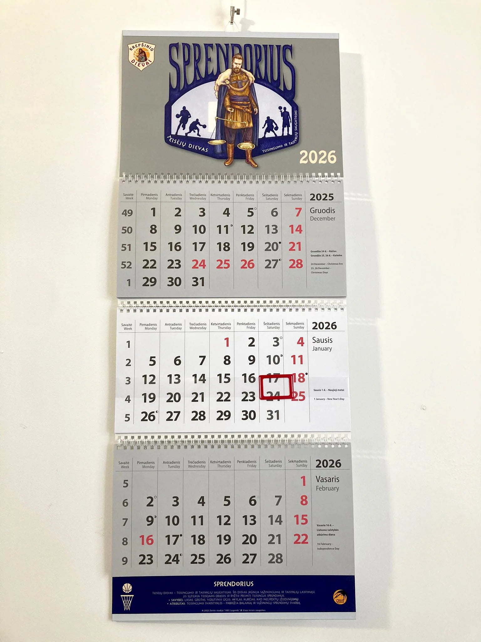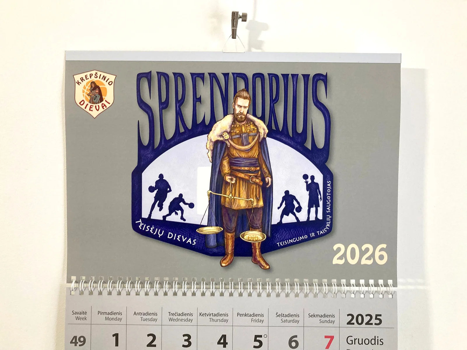 Kalendorius „Sprendorius“ – sieninis 2026 m kalendorius su originalaus kūrinio atspaudu iš serijos „Krepšinio dievai“. Pakabinamas kalendorius yra iš trijų dalių, kuriose matomi iš karto trys mėnesiai. Kalendorius yra su slankiojančiu dienos langeliu.