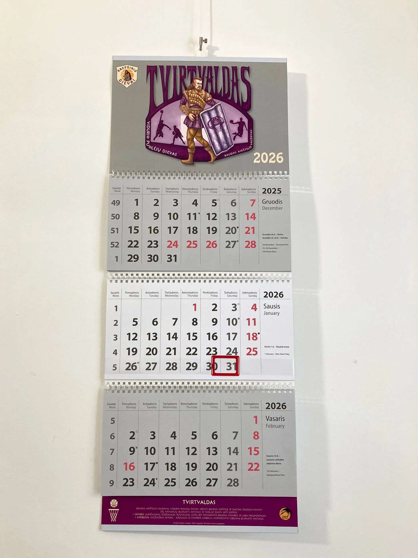 Kalendorius „Tvirtvaldas“ – sieninis 2026 m kalendorius su originalaus kūrinio atspaudu iš serijos „Krepšinio dievai“. Pakabinamas kalendorius yra iš trijų dalių, kuriose matomi iš karto trys mėnesiai. Kalendorius yra su slankiojančiu dienos langeliu.