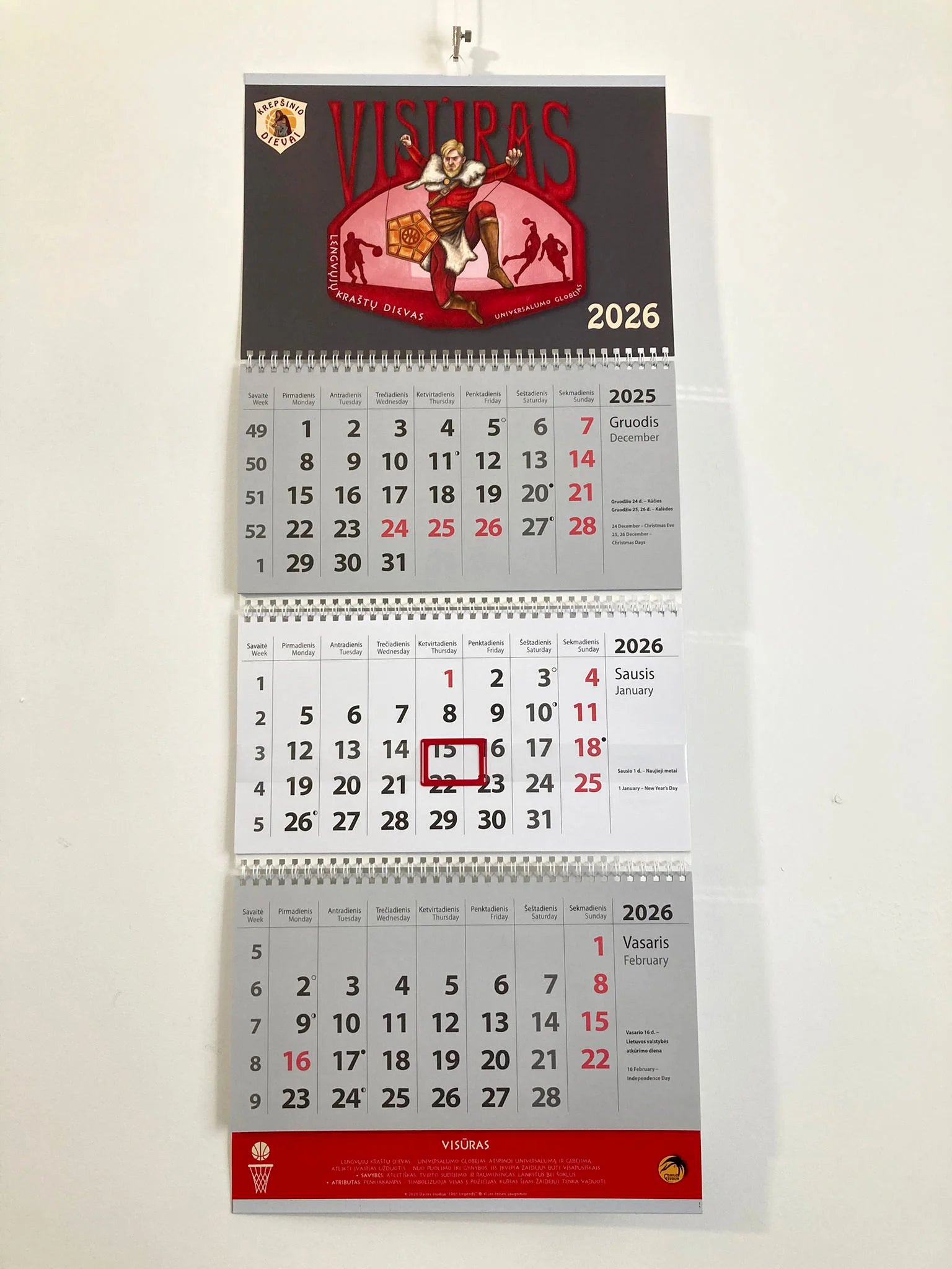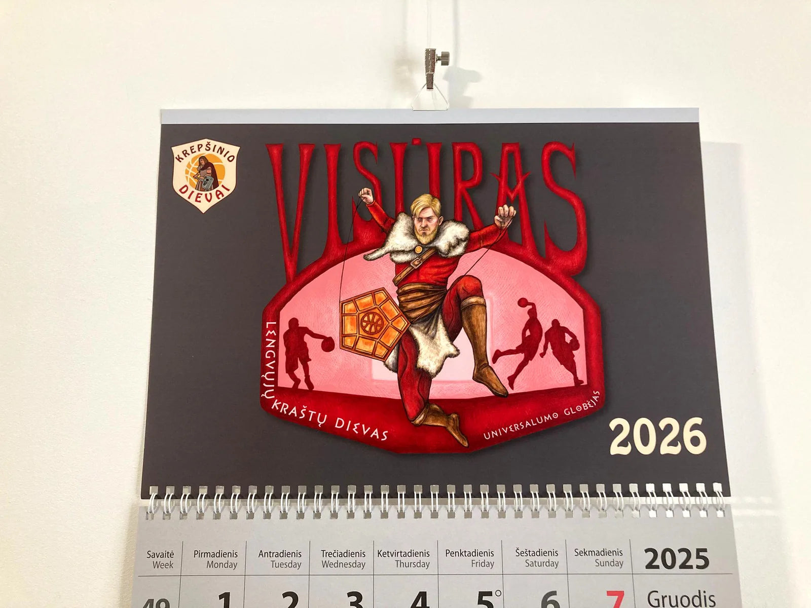 Kalendorius „Visūras“ – sieninis 2026 m kalendorius su originalaus kūrinio atspaudu iš serijos „Krepšinio dievai“. Pakabinamas kalendorius yra iš trijų dalių, kuriose matomi iš karto trys mėnesiai. Kalendorius yra su slankiojančiu dienos langeliu.